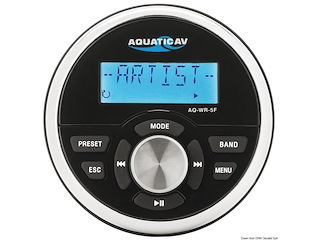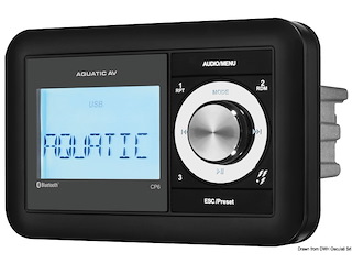- Dispositivi supportati: Bluetooth, USB, MP3, AM, FM, DAB (tramite adattatore 29.548.83), AUX (tramite connettore posteriore USB);- display: schermo TFT;- entrata: Bluetooth, 1 USB , 1 coppia di RCA;- uscita: 1 coppia di RCA pre-out da 2 V;- sintonizzatore AM/FM;- potenza (max): 4x45 W (4 ohms), 4x 72 W (2 ohms);- tensione di uscita: 10,5 V - 14,4 VDC;- grado di impermeabilità: IP65;- accessori: orologio (incluso);- altre caratteristiche: inossidabil