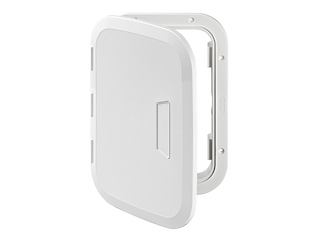 Sportello in ASA, colore bianco , resistente ai raggi UV, apribile a 180° con maniglia push-pull e chiusura a scatto. Montaggio verticale