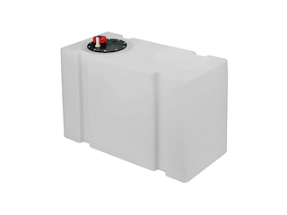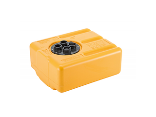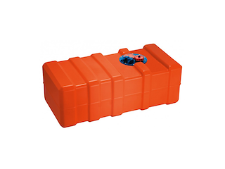 Serbatoio in plastica per carburante approvato Ri.Na., certificato CE ISO 21487 completo di boccaporto di ispezione, tappo con sfiato, pescante Ø mm.10 e sfiato Ø mm.16. Predisposto per il montaggio di un secondo pescante o ritorno e di sensore VDO, VEGLIA, ecc.