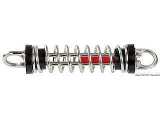 Molla ormeggio in acciaio inox HR specifico silenziata da tappi anticigolio, è provvista di fine corsa antisnervamento e le particolari teste consentono una perfetta assialità durante la compressione. Filo Ø mm. 6, molla Ø mm. 70, lungh mm. 350, per barche fino a 8 metri o 6 tonnellate, carico di rottura kg. 1830