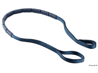 Cinghia ormeggio brevettata carico di rottura kg 11800 superiore alla catena Ø mm 14. Completa di inserti antiabrasione. E’ pulita e sicura, evita danni alla barca in caso di urto, non porta ruggine a bordo, non crea correnti galvaniche , corrosione alle molle di ormeggio, ed evita il danneggiamento per attrito delle bitte e/o degli anelli del porto. Colore blu navy.