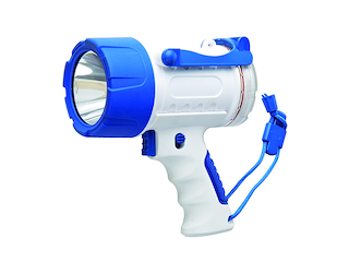 Proiettore impermeabile IP 67 a 3 Led tipo Cree da 5W (1200 lumen) a 3 modalità di illuminazione alta/bassa/flash. Ricaricabile a 12V e 230V. Dimensioni cm. 34x27x15. Peso kg. 1,25.