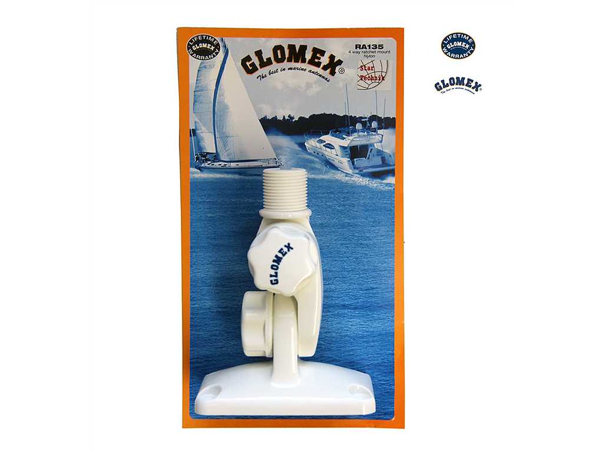 Glomex RA135, base a doppio snodo in nylon rinforzato resistente ai raggi UV. Bloccaggio a monopola. Foro per passaggio cavo. Filettatura standard 1" 1/4. Utilizzabile anche ccon antenne lunghe di 240 cm. autoportanti.