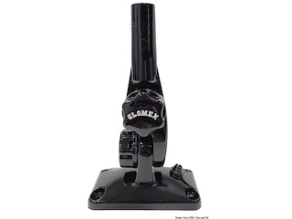 Base a doppio snodo in nylon rinforzato resistente a raggi UV con bloccaggio a leva per pulpito o ponte. Foro per cavo coassiale e passacavo per GPS. Utilizzabile con antenne autoportanti non più lunghe di 2,40 mt. Filettatura standard 1”x14.