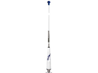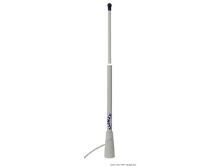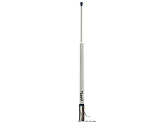 Per piccole/medie imbarcazioni, completa di base acciaio inox abbattibile. Fabbricata in fibra di vetro a doppio spessore, protetta con 5 mani di vernice ai poliuretani. Guadagno 3dB, potenza entrata max 100 W, completa di 4,5 m di cavo coassiale RG58. Lunghezza 100 cm.