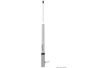 In vetroresina bianca per radiotelefoni VHF, lunghezza 2,40 m, completa di 4,5 m di cavo coassiale RG-58 e connettore finale ottone cromato. Guadagno 6 dB. Massima potenza d’entrata 100 W. Modello particolarmente indicato per scafi a motore. Parti metalliche in ottone cromato. Viene fornita senza base.