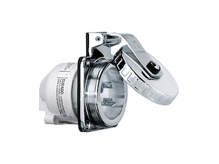 Presa in policarbonato a tre fili, contatti in nichel anticorrosione. Si abbina alle spine art. 3939600/1 A Norme CEE, per Il collegamento della orrente dalla banchina alla barca.