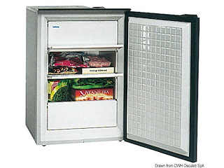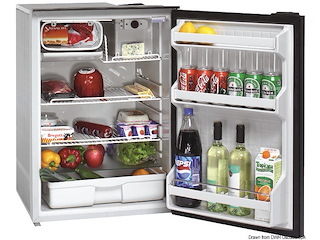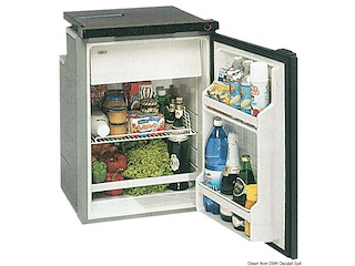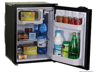 Frigorifero Isotherm CR 85 EN con piastre di accumolo. Consumo da 0,6 a 2,5 Amp. Peso 18 Kg. Misure (Alt x Larg x Prof) 625 X 475 x 515 mm . La profondità di 475 mm, può essere ridotta di 160 mm in quanto il compressore può essere smontato semplicemente dal corpo del frigo e installato dove si preferisce nel raggio di max 1,5 mt. La profondità si intende porta e maniglia esclusa (± 40 mm) .