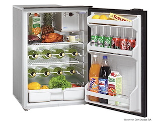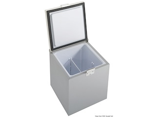 Fondo in plastica, cestelli interni estraibili. Compressore Secop a voltaggio universale 12/24 V.