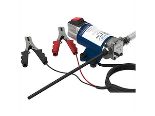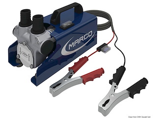 Girante a palette. Corpo alluminio con attacco rapido per tubo 25 mm. Carter con maniglia, interruttore ON/OFF, pinze batteria. Completa di filtro EMI. La pompa è adatta per travasi da un serbatoio all'altro.