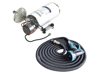 Kit ideale per operazioni di lavaggio ponte con acqua salata e dolce.Composto da :- elettro-pompa auto-adescante ad alta pressione con controllo elettronico, dotata di ingranaggi elicoidali in PEEK;- 15 m di tubo allungabile;- pistola a spruzzo con connessione a scatto, blocco del getto, valvola di ritegno e grilletto con regolazione del flusso.