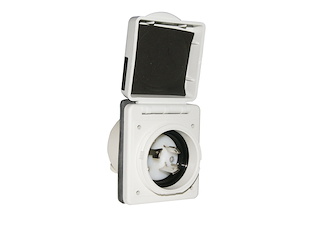 Spina ad incasso in poliestere rinforzato per presa art.3939616.Sistema easy lock,stagna con protezione posteriore con sfiato. Per il collegamento della corrente dalla banchina alla barca.