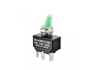 Interruttorea levetta illuminato, con cappuccio trasparente e stagno. Amperaggio massimo16A a 12V. Dimensioni mm. 35 x 20,4 x 21h. Perno Ø mm. 12.
