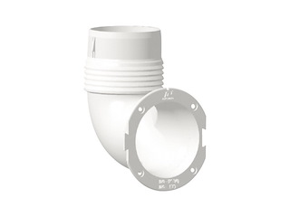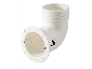 Raccordo a gomitopuò essere fissato attraverso la parete divisoria con le due alette laterali autobloccanti. Non ci sarà più bisogno di fare i fori laterali per il fissaggiodelle viti. Infatti grazie alle due viti in acciaio A4 TORX integrate ai lati, sarà sufficiente avvitare quelle e le alette si bloccheranno automaticamentecontro la parte posteriore della paratia. Spessore massimo paratia: 25 mm. Può anche essere fissato ad un sistema di ventilazione interna con4 viti (non fornite). Può esser