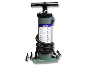 Gonfiatore a mano doppio flusso, corpo in ABS e protezione antisabbia. Pressione massima bar 1 (14,5 psi). Completo di raccordi.