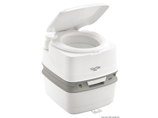 Toilette portatile che non necessita di essere connessa ad un impianto, caratterizzata da un design rivoluzionario, elevata qualità dei componenti e funzionalità.La toilette è formata da 2 sezioni: la superiore con l'acqua pulita per lo scarico e quella inferiore con il serbatoio di raccolta.Colore bianco e grigio.