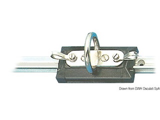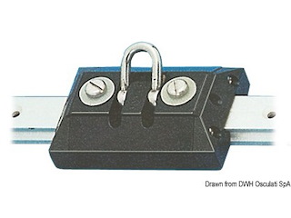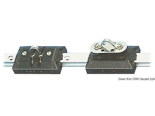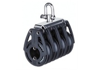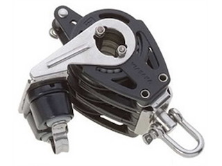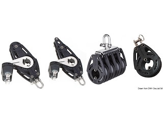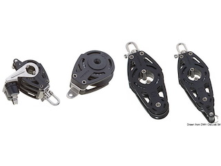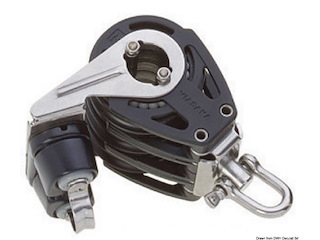 Con sfere in acciaio inox + cricco. Puleggia Ø 57 mm, scotta max Ø 10 mm, carico di rottura 900 kg, carico di lavoro 205 kg.