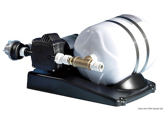 Completa di serbatoio di accumulo da 8 litri. Compatta e completa di supporto di facile installazione. Può girare a secco senza rovinarsi. Autoclave automatica WHALE Water System silenziosa 24 Volts. Raccordo rapido di entrata e uscita da 15 mm. .