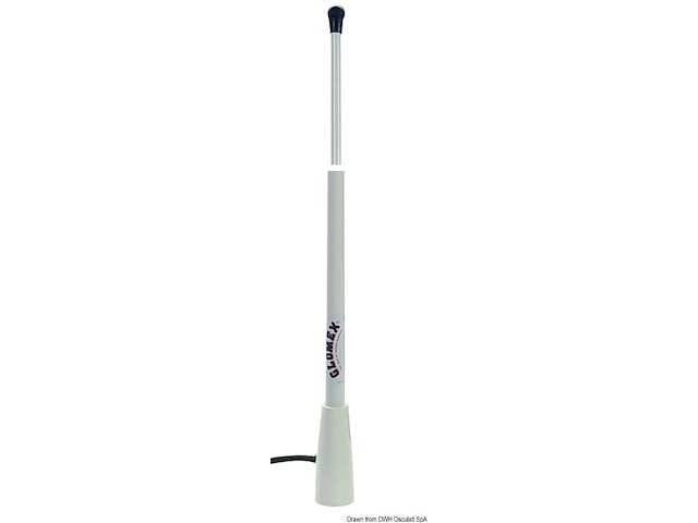 In fibra di vetro per radio telefoni VHF, lunghezza 1,5 m. Guadagno 3 db, potenza massima applicabile 100 W. Fornita senza base.