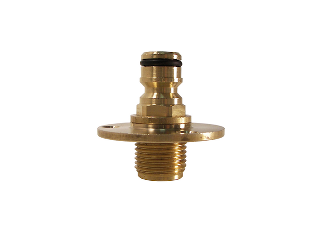 Raccordo maschio da 1/2’, compatibile con tutti i sistemi rapidi in commercio in ottone e plastica, completo di rondella Ø mm. 50 con tre fori di fissaggio.Ideale per creare punti di collegamento alle manichette per il lavaggio ponte ecc...