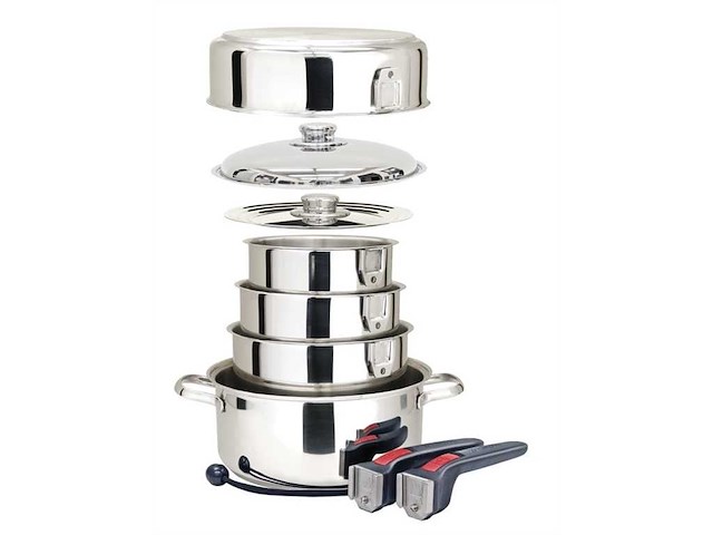 Batteria di pentole impilabile Popote MAGMA composto da 4 pentole, 1 tegame, 2 coperchi, 2 manici a scatto. Interno in acciaio inox. Altezza set impilato 18,5 cm. Diametro Ø 25 cm. .
