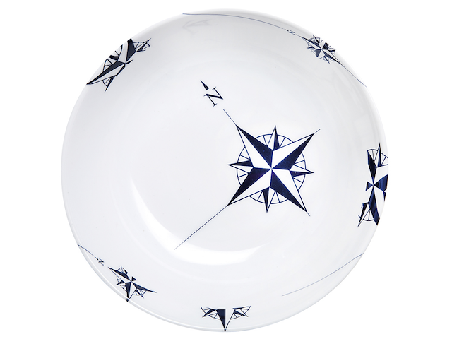 Servizio da tavola realizzato in melamina al 100%. Sui toni del blu navy e bianco. Lavabili in lavastoviglie. Le stoviglie, le tazze e i bicchieri hanno un anello antiscivolo alla base che ne impedisce lo scivolamento sul tavolo.