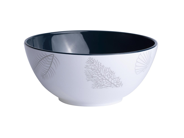 Servizio da tavola realizzato in Melamina al 100%, PBA Free. Sui toni del blu navy e beige, decorato con disegni di coralli e conchiglie. Lavabili in lavastoviglie. Le stoviglie, le tazze e i bicchieri hanno un anello antiscivolo alla base che ne impedisce lo scivolamento sul tavolo.