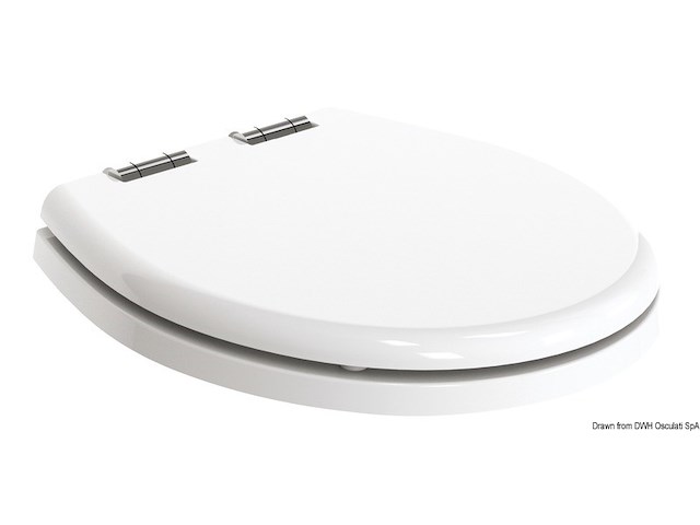 Coprisedili adatti alle diverse generazioni di wc elettrici Tecma, colore bianco, provvisti di sistema di chiusura frizionata.Sono disponibili in due versioni:A) con anima in legno ricoperta di poliestere e cerniere in acciaio inox;B) in plastica termoindurente (versione leggera che nasconde il sedile).