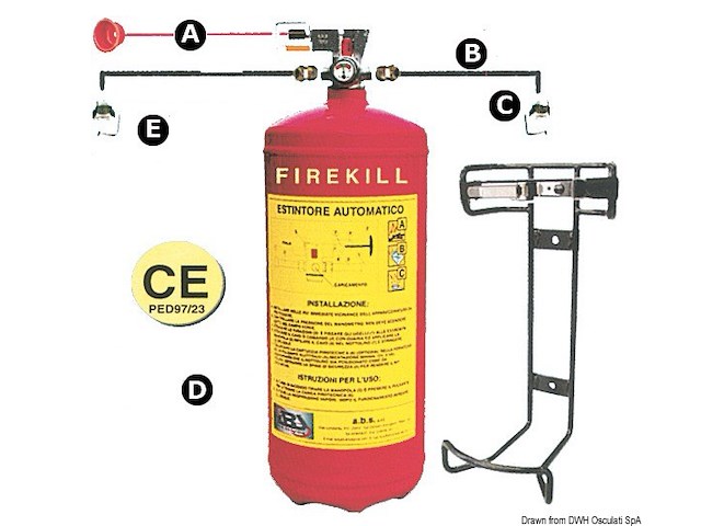 Omologati RINA; modelli a polvere con azionamento automatico tramite rottura di un ampolla di vetro a 93°, oppure manualmente tramite flessibile con comando a distanza. Il kit é composto da: bombola caricata a polvere ABC 30%; valvola speciale con doppia uscita: per collegare più ugelli con più tubo di rame; maniglia di comando a distanza con cavetto in acciaio; ugelli più tubo di rame da mm 8x10.Nuova versione 2017 che soddisfa ISO 9094 con pressostato da collegare ad una