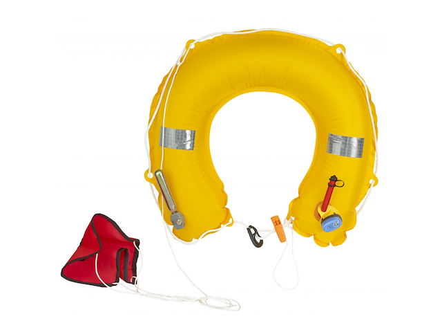 FERRO DI CAVALLO GONFIABILE SENZA LUCE Art. P64888 Salvagente gonfiabile a ferro di cavallo da lancio per il recupero di un uomo a mare, in nylon giallo spalmato poliuretano. Galleggiabilità 117N. Dotato di nastri riflettenti, di ancora galleggiante, fischietto e contenitore in ABS rigido fissato al supporto da un cordino.