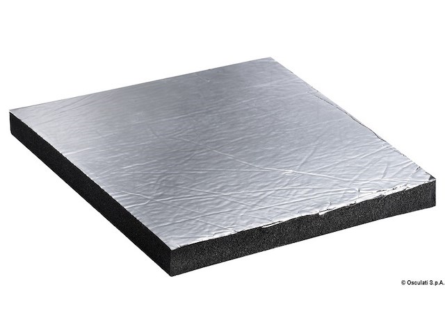Lastra di poliuretano alluminizzato. Poliuretano 70/90 kg/m3 spessore 25 mm, adesivo.Testati secondo la ISO 4589-3 determinando l'indice di ossigeno con prova a temperatura elevata.Certificati da R.I.Na. per l'isolamento acustico di locali apparato motori di unità da diporto fino a 24 m.