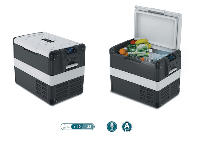 Dotato di pannello comandi, coperchio amovibile, luce a LED interna, dual power (12/24Vdc - 100/240Vac), cestello estraibile. Capacità totale litri 65, peso netto Kg. 23. Alimentazione 12/24Vdc - 100-240Vac 50/60Hz, consumo nominale 55W. Dimensioni : larghezza totale mm. 455, altezza totale mm. 560, profondità totale mm. 710. Classe energetica A++. Range temperatura interna +10°C / -22°C .