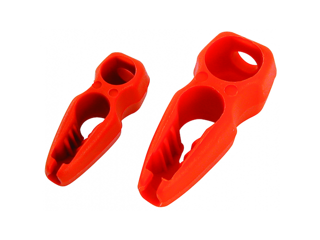 Gancetto in nylon grazie alla sua forma consente di bloccare la corda alla misura desiderata per legare vele o oggetti in generale. Per cime o corde elastiche di Ø mm. 4/6. Colore arancione. Confezione 6 pezzi
