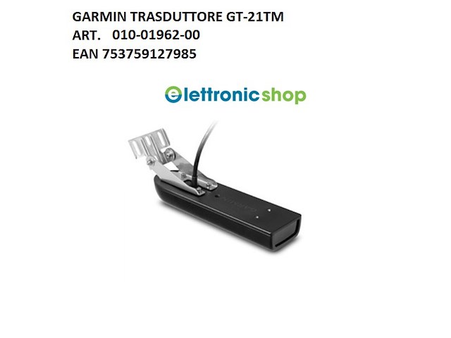 GARMIN TRASDUTTORE GT21-TM ART.010-01962-00 DOWN VU 500W (DOWVU 260/KHZ) TRADIZIONALE 600W (50/200KHZ) Weight: 1.69 lbs. (0.77 kg) Cable length: 30 ft Number of pins on connector: 8 Dimensions: Transducer: 9.0 x 2.5 x 1.2 in (228 x 62 x 30 mm) Frequency: Traditional: 50/200 kHz DownVü: CHIRP 245-275 kHz and CHIRP 445-465 kHz Transmit power: Traditional: 600 W DownVü: 500 W Max Depth: �