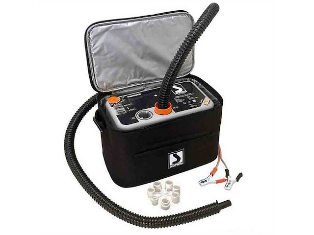 Portata 1000L/min pressione 250 mbar. Pressione regolabile fra 175 e 250 mbar con ARRESTO AUTOMATICO . Equipaggiato con 2 potenti motori su cuscinetti montati su una piastra in alluminio per dissipare il calore . Cavo ad alto rendimento di 3 metri . Tubo di diametro maggiorato di 3 metri Fusibile di sicurezza. Molto flessibile: può gonfiare grosse camere e piccoli oggetti. Completo di sacca di custodia imbottita e raccordi per riduzioni. Tensione: 12V DC - Portata 1000l/m - Pressione: 250 mbar -