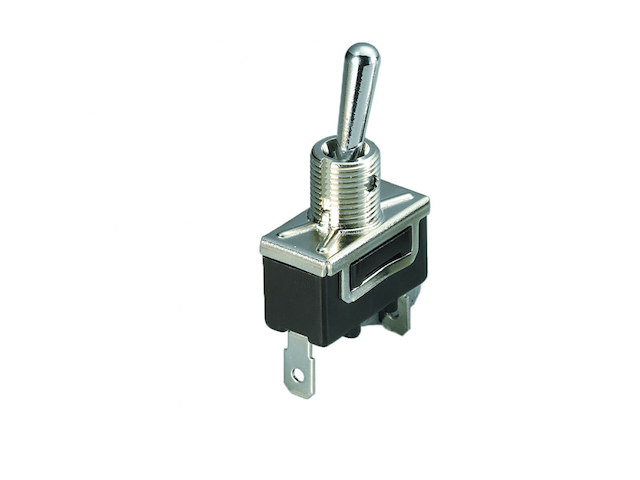 Interruttore corpo in termoindurente, levetta e bussola in ottone nichelato. Terminali a lamella per faston femmina. Capacità max 15 Amp a 12V. - 10 Amp. a 24V. per art. 3901044/64/74/76, 3939223/5/7