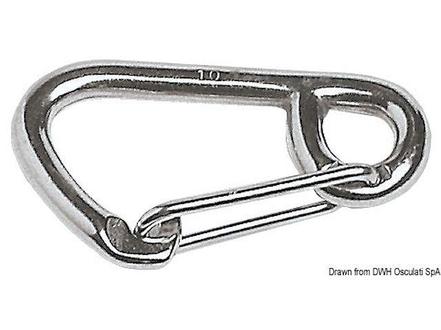 In acciaio inox AISI 316 lucidati a specchio. Risolvono il problema dei moschettoni legato alla scarsa apertura degli stessi.