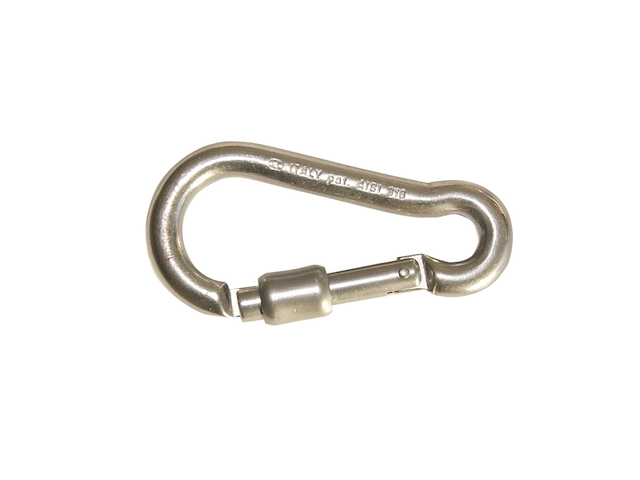 Moschettone in acciaio inox AISI 316. Modello con chiusura con pistone a molla, apertura esterna. Chiusura Key-Lock. Dimensioni: Ø 10mm. Lunghezza 100mm. Carico di rottura 1200 kg.