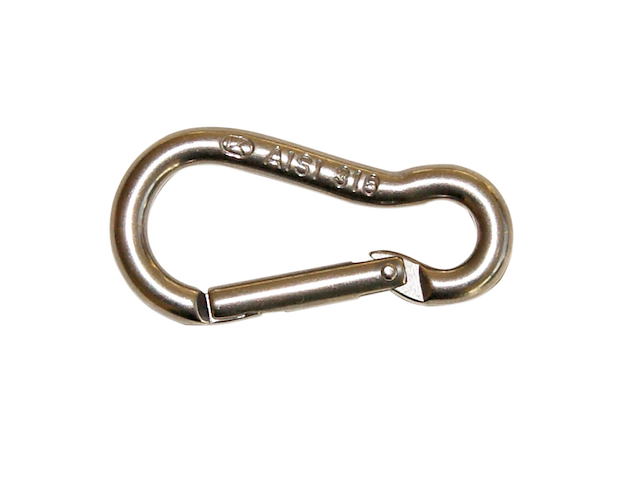 Moschettone in acciaio inox AISI 316. Modello a pera. Chiusura Key-Lock. Dimensioni: Ø 13mm. Lunghezza 160mm. Carico di rottura 2400Kg.