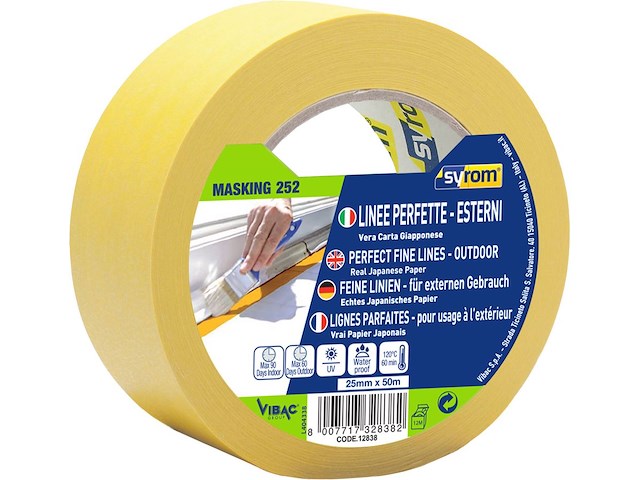Nastro in vera carta di riso giapponese (Washi), per mascherature in esterni a lungo termine. Per mascherature e linee perfette, in esterni e in carrozzeria. Adesivo acrilico. Alta conformabilità. Compatibile con vernici e pitture. Buona resistenza meccanica. Colorazione della carta ad alta evidenza. Definisce profili di elevata precisione. Resistenza ai raggi UV fino a 60 giorni. Nessun residuo di adesivo alla rimozione. Resistenza alla temperatura di 120 °C per 60 minuti. Resistente