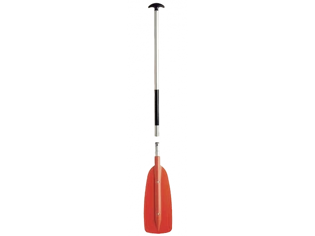 Pagaia divisibile in lega leggera anodizzata tubo Ø mm.30 divisibile, pala in ABS di colore rosso. Lung. cm. 150, smontata lung. cm. 88. Peso gr. 850.