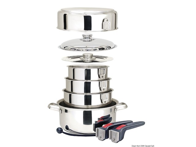 In acciaio inox AISI 316 lucidato a specchio. Utilizzabile anche con fuochi ad induzione. Provvisto di speciali manici a scatto removibili.