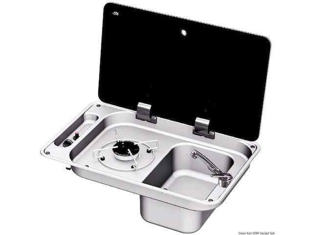 Completo di lavello e rubinetto con miscelatore acqua calda/fredda.