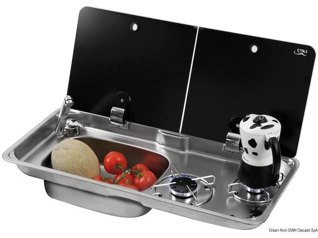 Completo di lavello e rubinetto con miscelatore acqua calda/fredda.