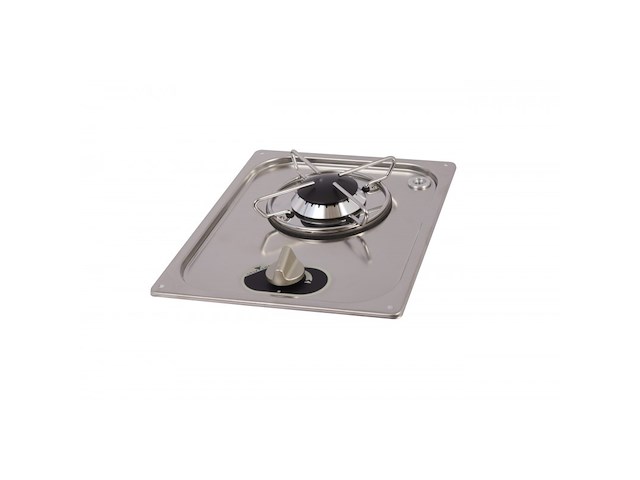 Piano cottura a gas con accensione manuale, in acciaio inox lucidato a specchio. Montaggio ad incasso. Con termocoppia di sicurezza. Completo di viti di fissaggio. Con foro per ferma pentole. Certificati CE.