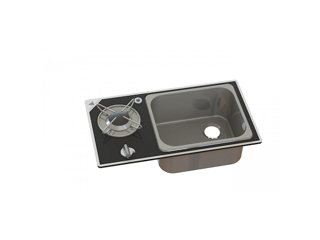 Piano cottura con lavello, a gas con accensione manuale, in vetro temperato nero con spessore di 8 mm. Montaggio ad incasso. Con termocoppia di sicurezza. Piletta non inclusa. Con foro per ferma pentole. Certificati CE.
