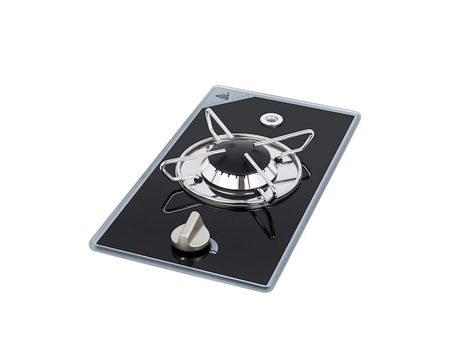 Piano cottura a gas con accensione manuale, in vetro temperato nero con spessore di 8 mm. Montaggio ad incasso. Con termocoppia di sicurezza. Con foro per ferma pentole. Certificati CE.