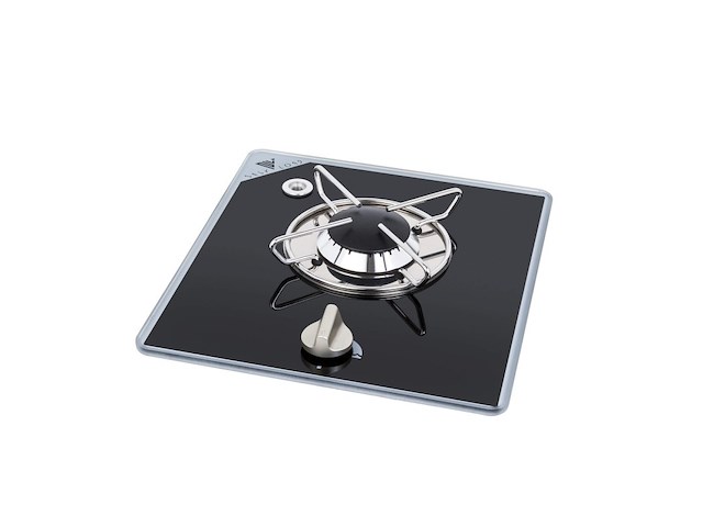 Piano cottura a gas con accensione manuale, in vetro temperato nero con spessore di 8 mm. Montaggio ad incasso. Con termocoppia di sicurezza. Con foro per ferma pentole. Certificati CE.