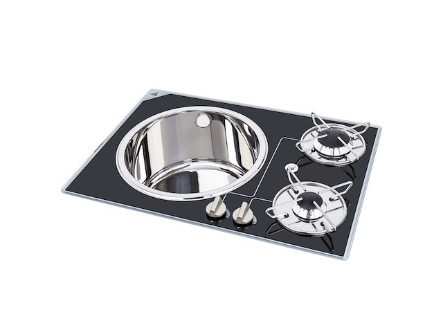 Piano cottura con lavello, a gas con accensione manuale, in vetro temperato nero con spessore di 8 mm. Montaggio ad incasso. Con termocoppia di sicurezza. Piletta non inclusa. Con foro per ferma pentole. Certificati CE.