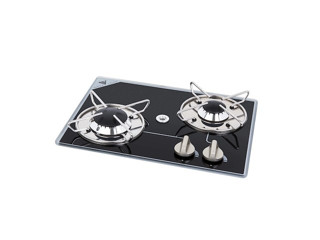 Piano cottura a gas con accensione manuale, in vetro temperato nero con spessore di 8 mm. Montaggio ad incasso. Con termocoppia di sicurezza. Con foro per ferma pentole. Certificati CE.